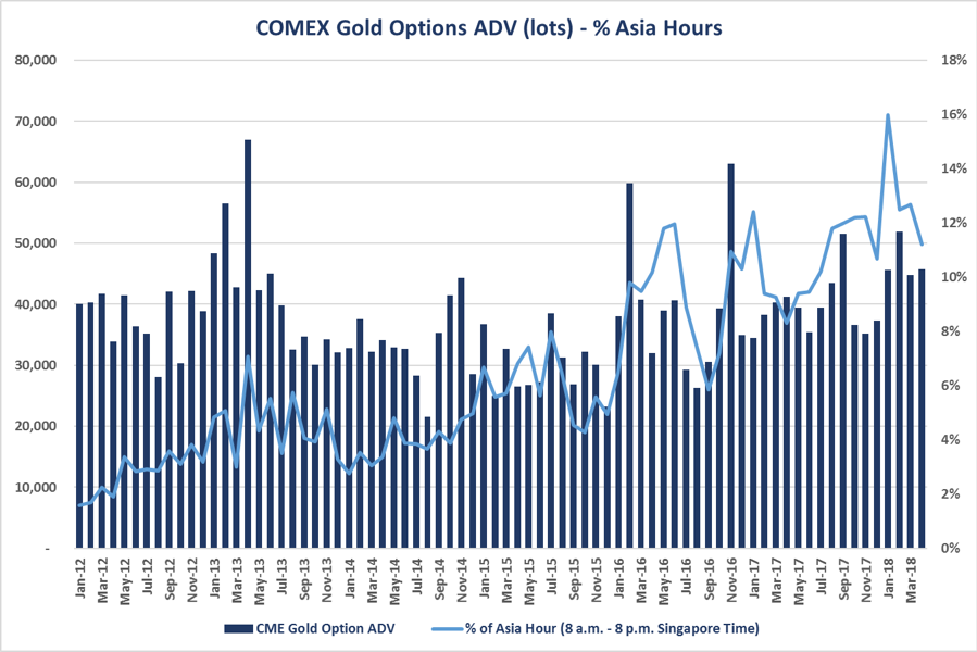 Also, as COMEX Gold Options became more electronic, the proportion of volumes transacted during Asia hours has increased, testifying to the benefits of electronic trading. In 2012, about 2% of the overall OG were traded during Asia hours. That figure increased to over 10% in 2017, and the proportion is expected to rise further in the future.
