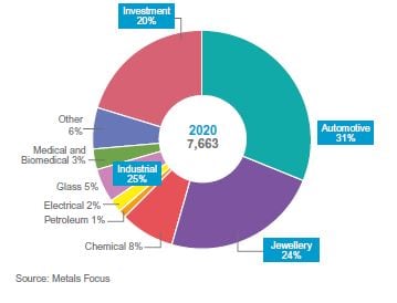 Figure 2: Sources of industrial platinum demand in 2020, 7,663 koz