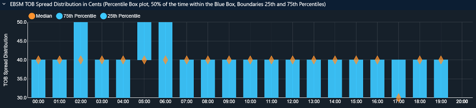 A box-whiskers (percentile) plot that buckets TOB EBS Market spreads into an hourly statistical plot. The median spread is shown in orange. The blue box highlights the range observed 50% of the time between the 25th and 75th percentiles.