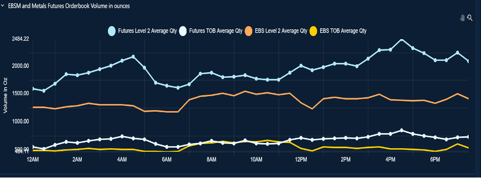 In addition to TOB data, you can choose to view spread and order size data for up to 10 levels of the orderbook. This allows traders to see how the spreads and order book depth change as multiple levels are selected. There is also a “Futures VWAP” selection which provides a volume weighted bid-ask spread from the metal futures order book for the equivalent volume quoted on EBS Market top of book; this allows you to compare spreads based on like for like order volumes from each market.