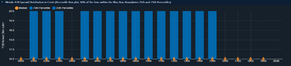 A box-whiskers (percentile) plot that buckets TOB metals spreads into an hourly statistical plot. The median spread is shown in orange. The blue box highlights the range observed 50% of the time between the 25th and 75th percentiles.