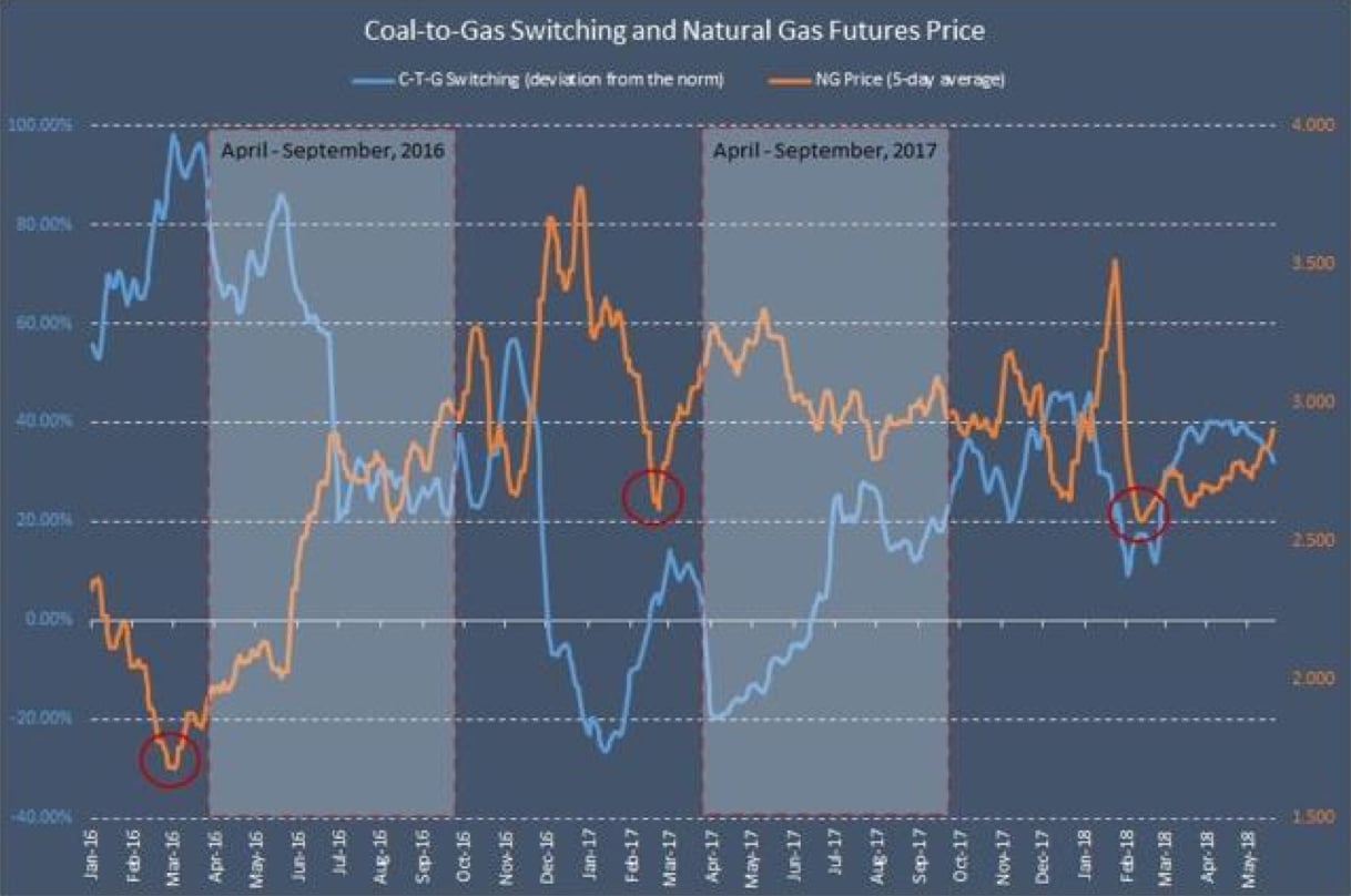 The next EIA report is due on June 7th, and the natural gas market will be watching to see if the extra hot weather in the US will be eating away at storage further. Because of the time lag in getting permits for wells issued and assembling the necessary manpower to work on gas rigs, it may well be after the summer in September, before enough production can be raised to offset the depletion of current storage. This means that enough demand for energy must be met by increased production from coal plants, which could happen if natural gas prices were to rise enough cause another drop in the coal-to-gas switching ratio for the summer months (grey areas in the chart below). Thanks to the recent rise in natural gas, the spread between natural gas and coal is down by a third since 2017, so the April to September period this year could also see less coal-to-gas switching, and more reliance coal as we saw in 2015.