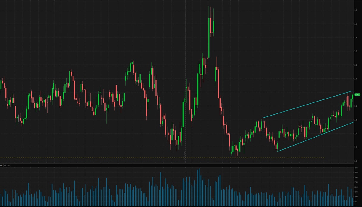 On Friday, natural gas futures settled at 2.9820 on light volume, up more than 1%. In the daily chart below, natural gas is traveling up within a rising price channel (in blue). After spiking as high as 3.628 back in January, it corrected all the way down to the lows of last year (yellow dotted line), where it found support ahead of the rally into the coming summer months.