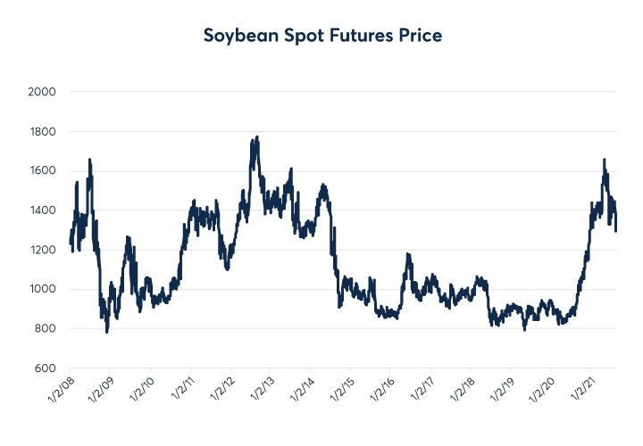 You can see that 2013 stands out in number of occurrences that implied volatility and price are both in the teens. Looking at a monthly Soybean chart over time helps give perspective.