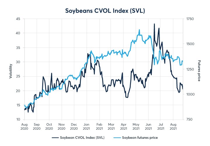 Looking at a CVOL chart for Soybeans (SVL) you see the decrease in 30 day volatility, SVL fell below 20% for only the second time in 2021. Out of all Grain & Oilseed products, Soybeans currently have the lowest implied volatility.