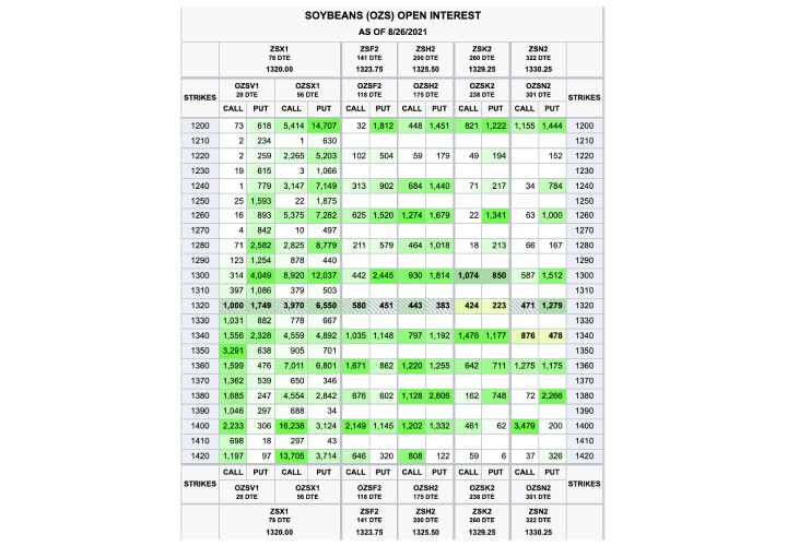 November Soybean options have ~60 days until expiration and are trading around a 19% volatility. The Grain & Oilseed market have a USDA WASDE on September 10, which will disclose more information around yield conditions. The Week 2 Soybean Weekly option expire on the same day as the September report. Market participants have utilized short term options at a record pace in 2021 with volumes up 114% for Soybean weeklies averaging 1.8K contracts a day.