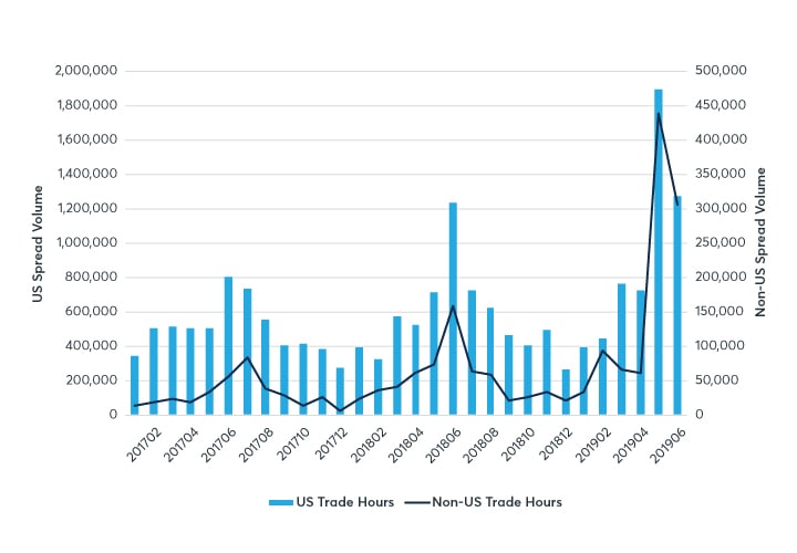 Last year’s 2019 US corn crop was marked by turbulence due to poor weather conditions and record prevented planting numbers coupled with trade war headlines happening during non-US hours. This resulted in record spread option volume as market participants from around the world accessed the market to manage their risk related to market events. Non-US spread volumes accounted for almost 20% of total spread volumes and 10% of total option volumes in the summer of 2019, demonstrating an increased demand and utilization for these strategies under volatile market conditions from overseas market participants.