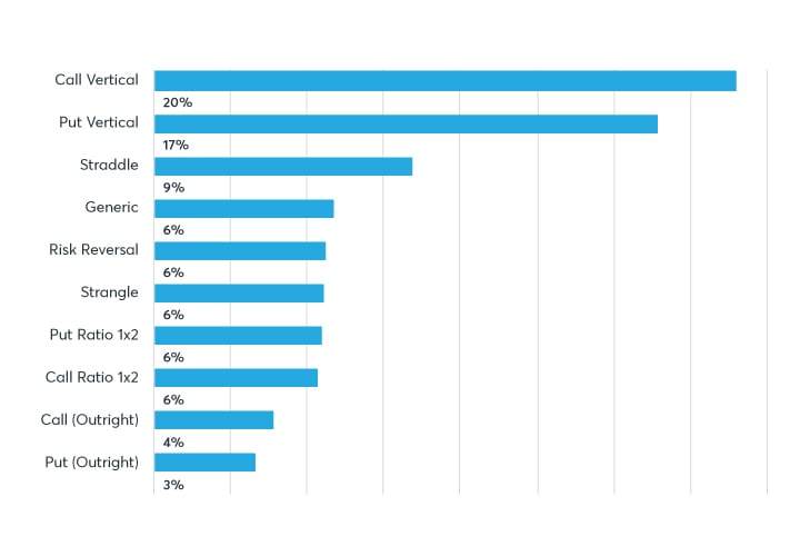 While the overall price movement of corn has been bullish since beginning of 2017, facing record harvests and poor marketing conditions due to the US-China Trade War, the price of soybeans over the same period decreased roughly 18%. In times of heightened volatility and large bearish price movement in soybeans, such as Q1 2017, Q3 2018, and Q1 2019, put verticals outweighed call verticals as a percentage of total Soybean spread strategy volumes.