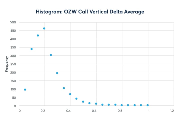 With over 33% of total Wheat spread option volume having a delta-hedged component versus 19% in Corn and 17% in Soybeans, covered spread option volume in Wheat also stands out relative to the other grains. A delta hedge is a way of managing the directional risk by taking a position in the underlying future. The position in the underlying has the effect of reducing the options exposure to directional risk and or making the position directionally neutral. With less exposure to directional risk, the options position takes on higher exposure to volatility. Traders who trade on volatility do not worry about the direction of price-moves, only how much the price of an instrument will move in the future i.e. volatility. Taking a closer look at the delta distribution in covered OZW Call Verticals data shows a concentration around the 20-delta strike seen in Figure 9. A similar 20-delta profile was observed in Wheat put verticals volume.