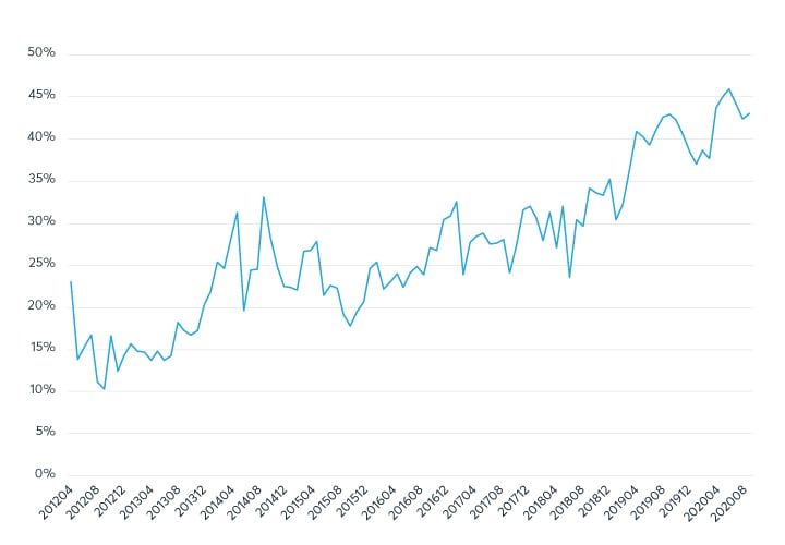 The 2019 and 2020 marketing years have experienced unprecedented volatility in Lean Hog options following the emergence of African Swine Fever (ASF) in China, the US-China Trade War, and the COVID-19 pandemic. As shown in Figure 3 above comparing monthly Put Vertical trading volume to implied volatility, option spread volumes tend to increase during periods of heightened volatility when option premiums are driven higher. Using one part of an options spread strategy to fund the other, these mechanisms offer downside coverage at more affordable premium costs vs. an outright put. In the case of Put Verticals, similar to Call Verticals, they offer market participants the ability to participate in upward or downward price movement at a known level of risk for a limited return by simultaneously buying and selling two different put options at the same time.