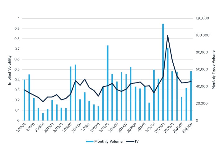 Figure 3: Monthly Lean Hog Put Verticals Volume vs. 30-day Implied Volatility