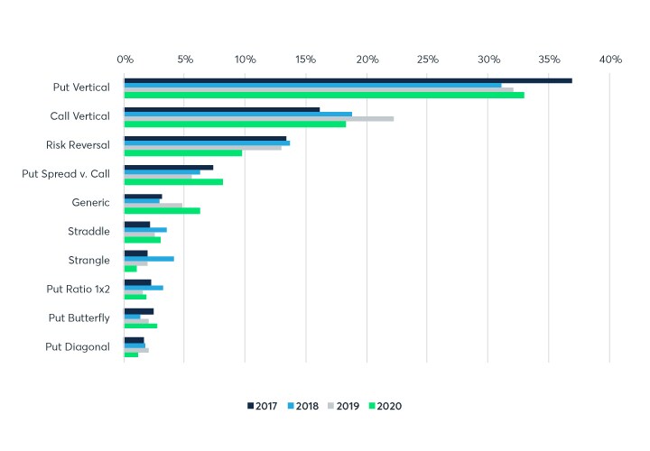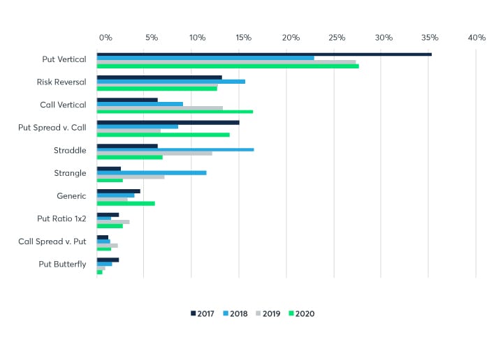 The most popular Live Cattle option spread strategies from 2017 through September 2020 (87 percent of total option spread volume) include: Put Verticals, Call Verticals, Risk Reversals, Put Spread vs. Calls, Straddles, Strangles, Put Ratio 1x2s, Put Butterflies, and Put Diagonals. Like Lean Hog volumes, Put Verticals lead the spread options volume in Live Cattle. However, Call Verticals rank much higher, averaging about 20 percent of the total Live Cattle spread option volume over the past four years. This could be indicative of the Live Cattle market structure in which commercial entities have price risk in both directions, purchasing live cattle and selling processed meat products.