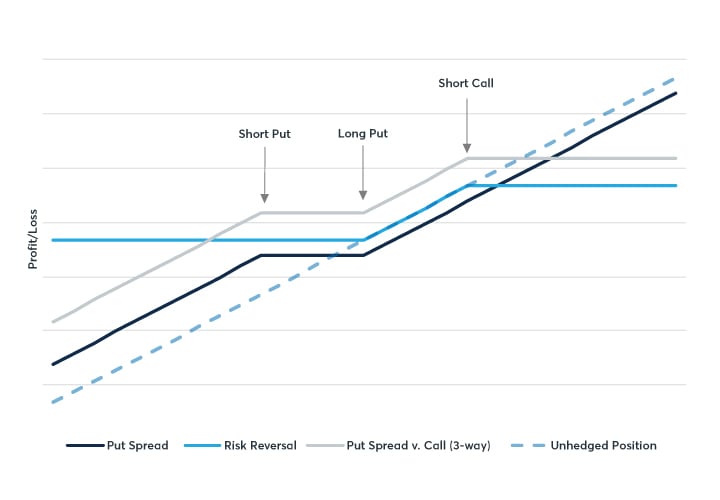 Figure 7: Risk-Reward Profile of Put Spread vs. Three-Way vs. Risk Reversal with Long Cash Exposure