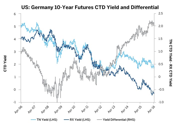 An example of this type of trade, using hypothetical nearby TN CTD yields and historical nearby RX CTD yields, is illustrated in Exhibits 6 and 7.