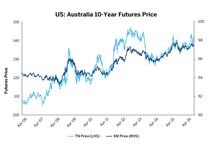 Exhibits 1-5 indicate how price action in TN and the yield of the underlying cheapest-to-deliver (“CTD”) 10-Year Note might have correlated with that of five comparable sovereign debt futures: Eurex Euro-Bund (RX) futures, ICE Long Gilt futures, TMX Ten-Year Government of Canada Bond (CN) futures, JPX 10-Year JGB futures (JB) and ASX 10-Year Bond futures (XM). Each depicts hypothetical fair-value estimates of daily settlement prices for nearby TN against actual daily settlement prices of the other sovereign debt contract, and the yields of the respective underlying CTD securities, from January 2005 through January 2016 for RX, CGB, JB, and XM, and from March 2015 through April 2016 for Long Gilt futures.