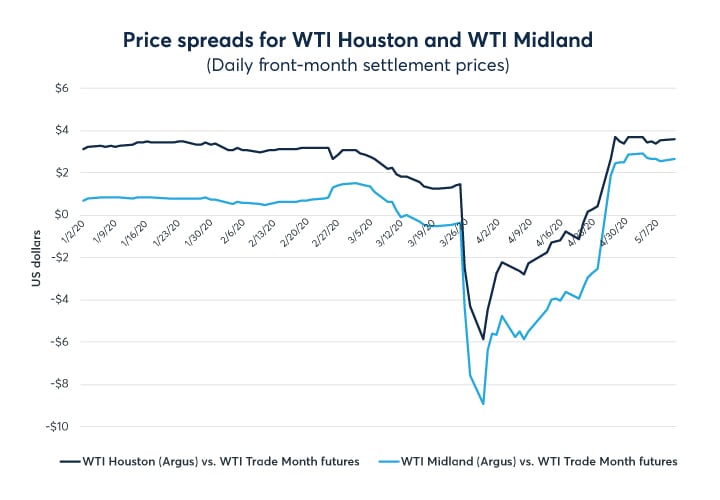 The price premiums that had previously prevailed for WTI Houston and WTI Midland (versus WTI Cushing) flipped into deep discounts in the first quarter of 2020 as exports dropped and as storage economics attracted barrels from Midland to Cushing. By late April 2020, the price discounts shifted back to price premiums for the WTI Houston and WTI Midland (versus WTI Cushing) spreads. The expanded pipeline infrastructure in the US Gulf Coast and Permian Basin has provided critical optionality to the marketplace, providing an outlet for barrels to flow to the Cushing hub to benefit from the storage economics in lieu of declining export arbitrage in the US Gulf Coast market. In fact, Enterprise Products Partners announced the reversal of one of its twin pipelines on the Seaway system to allow barrels to flow north-bound from the US Gulf Coast to the Cushing hub.