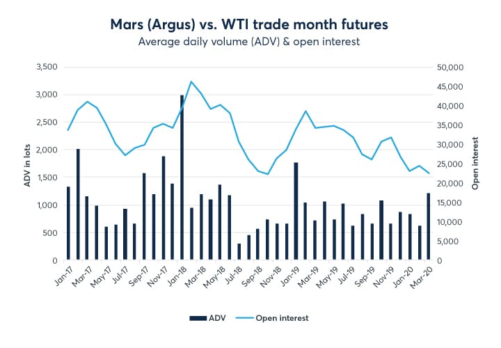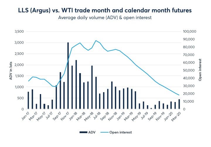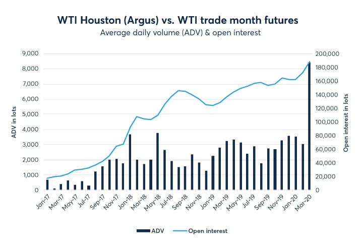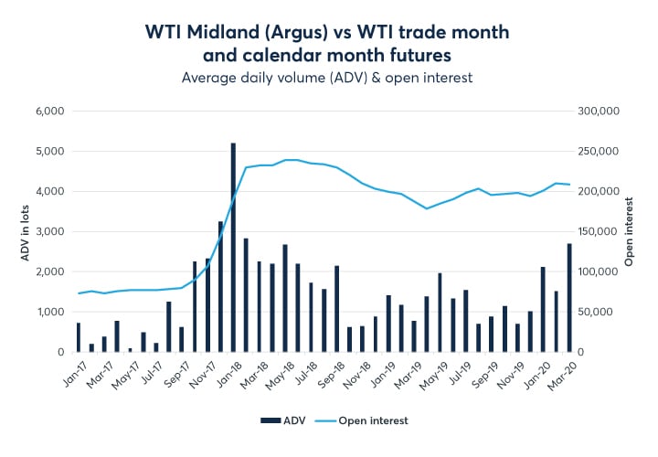 With the expanded pipeline connectivity and volatile export arbitrage, CME Group’s WTI Houston (Argus) vs. WTI trade month futures contract has exhibited strong gains in volume and open interest in the first quarter of 2020. Further, the WTI Midland (Argus) vs. WTI trade month and calendar month futures contracts have shown solid growth in volume and open interest, as the Midland barrels have been pulled to the Cushing market due to the storage incentives via the contango price structure in the NYMEX Light Sweet Crude Oil futures Contract.