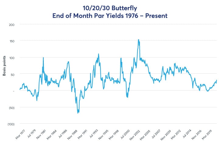 The shape of this part of the curve is frequently viewed through a curve butterfly or ‘fly,’ a formula that subtracts two times the 20-year bond yield and adds the 10-year note and 30-year bond yields. It is a visual measure of the shape of the curve. Using end-of-month par treasury yield curve data from the US Department of the Treasury from 1976 to present, one can see the behavior of this part the curve for around the last 45 years.