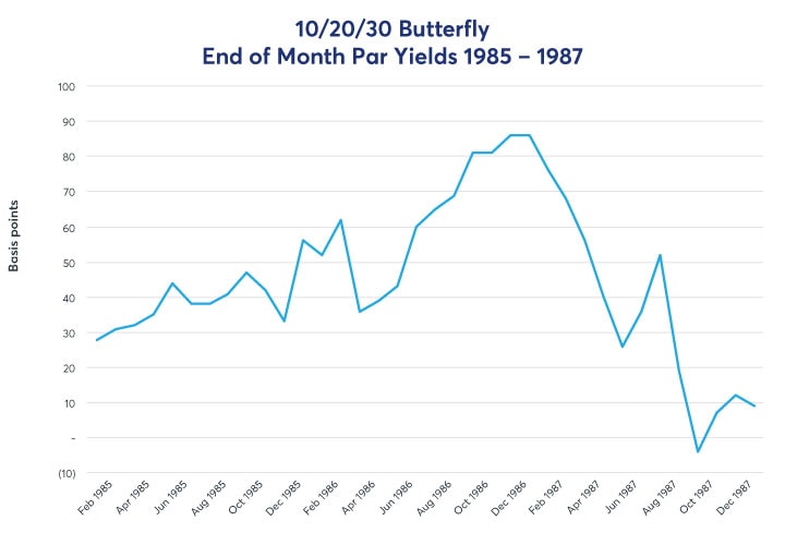 Narrowing the focus down to the mid-1980s, the last time the 20-year was issued, the curve shape was quite positive and grew more so when Treasury discontinued the issuance of the 20-year year bond. The 10/20/30 implied Treasury butterfly went highly negative as the economy and stocks struggled into ‘Black Monday’ on October 19, 1987.