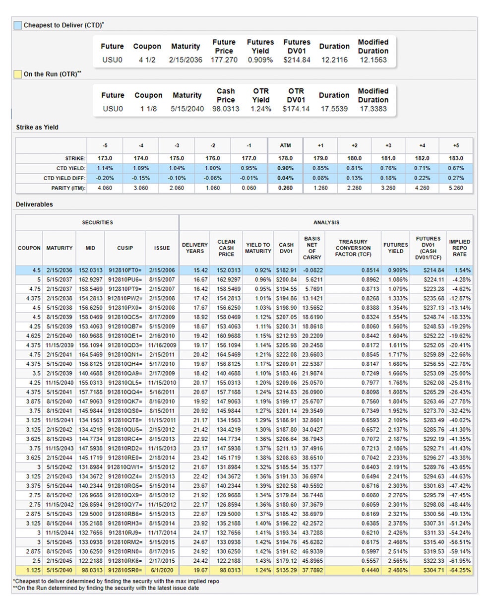 The newly issued 1.125 of May 15, 2040 is currently the most expensive to deliver and trade on spread to the 4.5s of February 15, 2036, the current CTD of the Classic Bond futures. While not a candidate to switch anytime soon, the Treasury Analytics tool is quite helpful to understand the nuances of the baskets, quickly see the underlying securities, and access top level analytics such as maturity, DV01, conversion factors and futures yield.