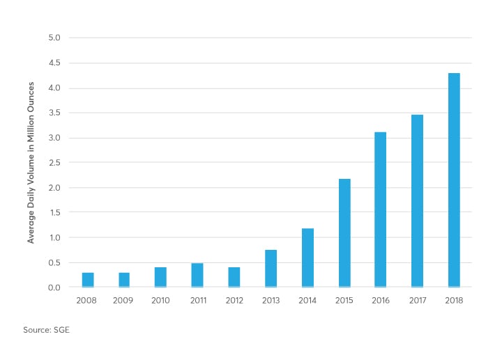 2. SGE data tracks both buys and sells. Therefore, published volume figures were halved to report in “round turns” and avoid double counting.