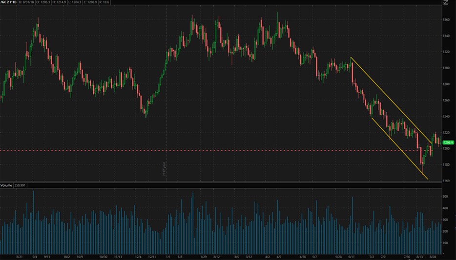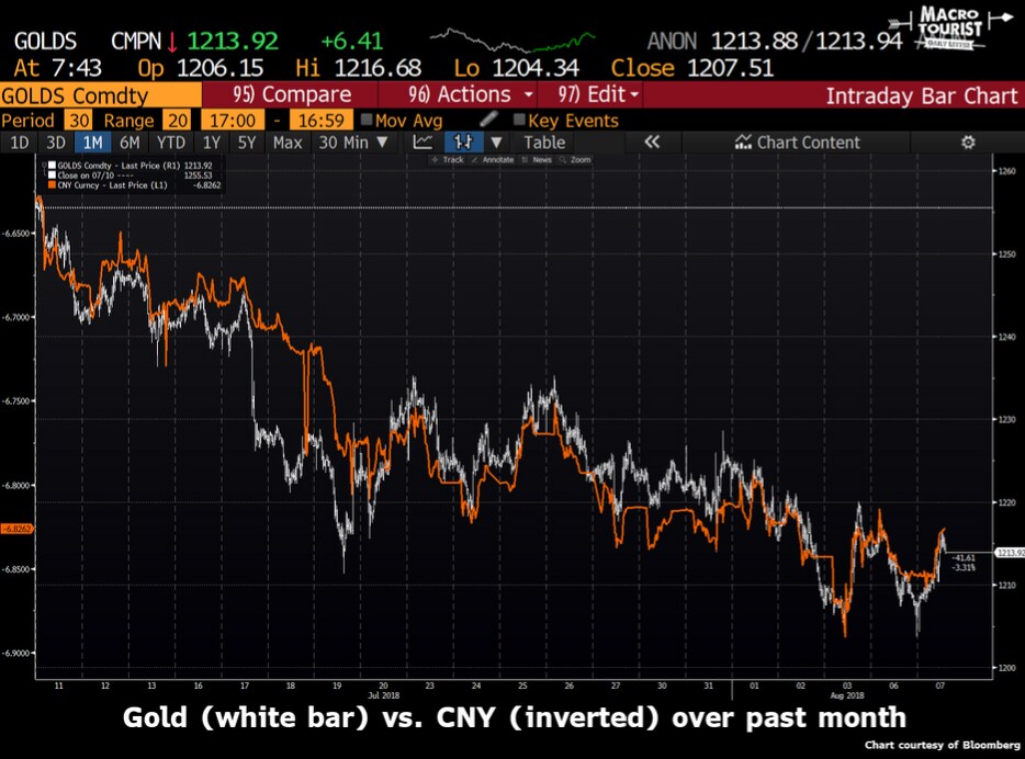One of the big casualties of the current trade tensions between China and the US has been the Chinese currency, the Yuan. In July, after the US talked of tariffs on Chinese goods, the offshore Yuan fell by the most since a devaluation in August of 2015. But an interesting correlation has now materialized between the Yuan and the price of gold. In the chart below, the price of gold (white line) has been declining all summer, but the Yuan (orange line) has also been declining against the US dollar. The day to day movements are almost a perfect correlation.