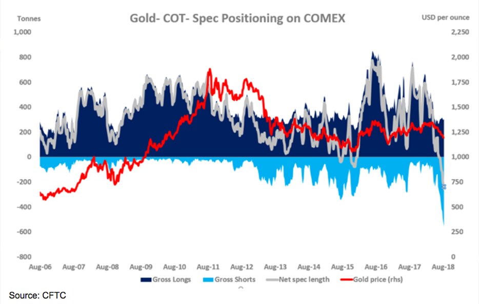 A trade deal could also cause gold to have a big rally because of positioning. 2018 has not been a good year for gold. Sentiment has now become so bearish that, according to the Commitment of Traders Report (COT) published by the Commodity Futures Trading Commission (CFTC), large speculators have never been more bearish on the outlook for gold prices since 2006. The paper gold market is divided between large speculators and large commercials. The large commercials have historically been the people involved in the business of producing and purchasing precious metals in the course of their regular business activities. Large speculators have historically been hedge funds and other money managers who bet on precious metals prices.