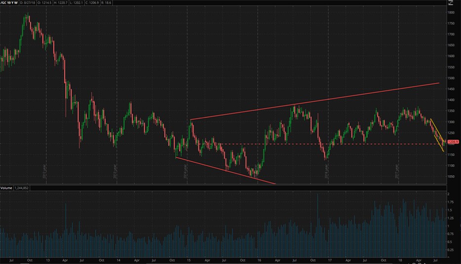 In the weekly chart below, gold had been consolidating within an expanding symmetrical triangle (in red) with its volume-weighted-average (VWAP) at the center line (dotted red line). After touching the top trendline on July 4, 2016, gold had a chance to make a quick return trip to the bottom trendline but instead reversed back up at the VWAP in January of 2017. It now appears to be finding support at the same level.