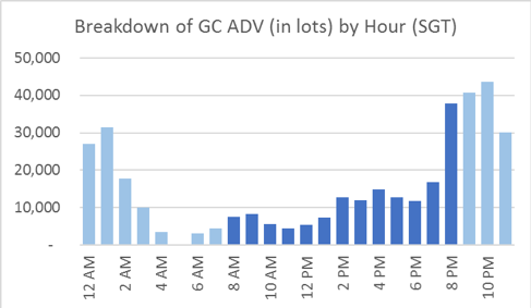 It is well known that COMEX has the highest traded volumes of Gold futures (code: GC) among all the global exchanges, at over 381,000 contracts2 (or 1,185,000 kilograms) a day. The gold market trades around the clock and CME Group offers trading virtually 24 hours per day enabling the world to access the market at times that work best for their schedules whether they are in Asia, Europe, Latin America or the United States. As a global product, GC offer great liquidity throughout the day. The volume of GC traded during Asia trading hours alone (which we have defined here as 8 a.m. – 8 p.m. Singapore time)3 is over 390,000 kilograms a day.