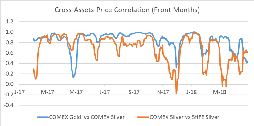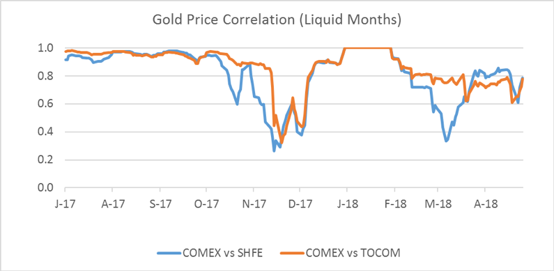- Average Price Level correlation of front-month Gold futures for July 2017 – April 2018 is 0.96 for COMEX vs SHFE, and 0.98 for COMEX vs TOCOM. Average Log Return correlation for the corresponding periods are 0.36 and 0.36 respectively.