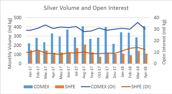 The features of the COMEX Silver contract are in Figure 9 and the monthly volumes and open interest are in Figure 10. The SHFE Silver contract is included for comparison.