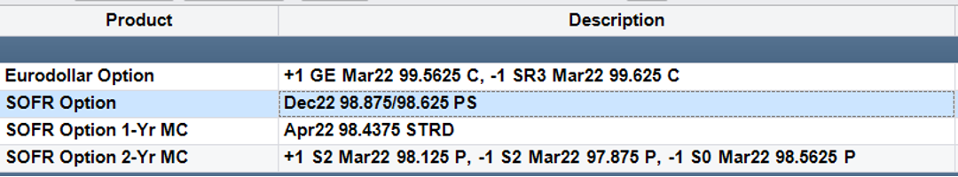 On Globex users have the ability to create strategies across all SOFR Options including Inter-Commodity spreads consisting of SOFR and Eurodollars together.