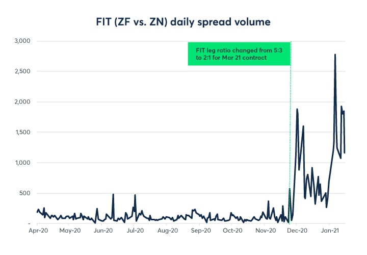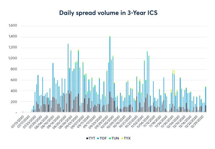 Propelled by a record first quarter, the FYT (+3 ZF, -2 ZN) spread remained the most actively traded ICS in 2020. Meanwhile, the lesser known 5s over 10s FIT spread saw trading volume spike in December following a change to the leg ratio from 5:3 to 2:1, a trend that has continued in early 2021. CME Group lists multiple ratio options for each Treasury spread, giving clients the flexibility to choose the instrument best suited to their risk management or trading needs.