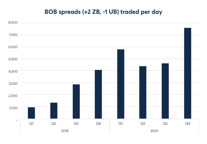 As a result, Bond vs. Ultra Bond (BOB) spread volume surged 135% YoY, becoming the most actively traded ICS instrument in the second half of 2020.