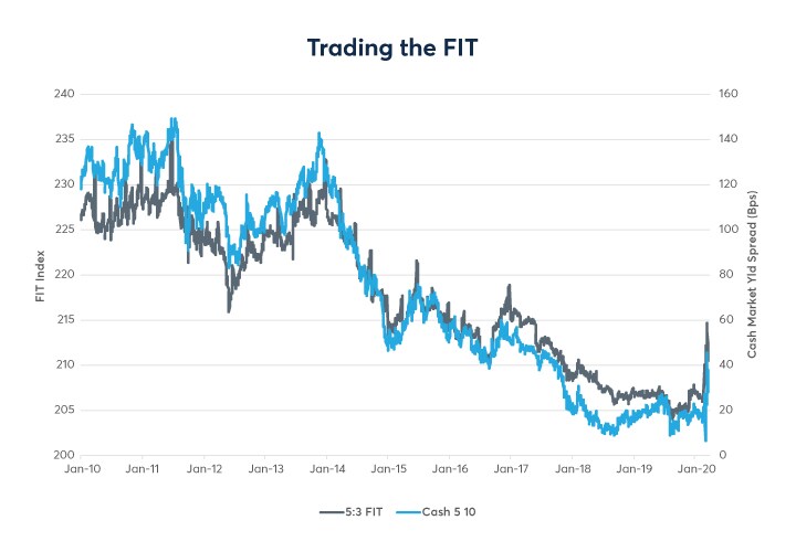 For example, for trading the popular 5s over 10s spread, users have two liquid instruments at their disposal. The 3:2 leg ratio FYT and the 5:3 leg ratio FIT. While FYT is the most actively traded ICS instrument, as shown below, the FIT’s 5:3 ratio has been a more precise DV01 proxy for trading the cash 5/10 spread in recent years.