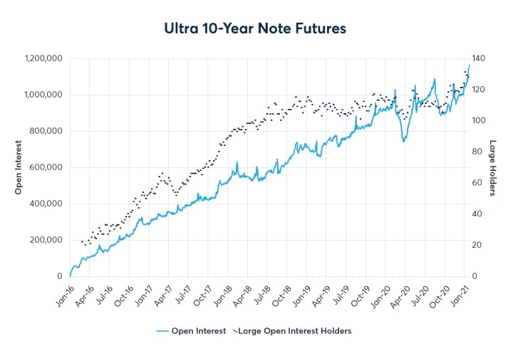 Another contributing factor has been the dynamic nature of the 10-year yield move over the last three months. In January alone, the CTD implied forward yield for Ultra 10-Year futures moved from a low near 0.90% up to 1.15% and closed the month at 1.10%. With some expecting that Treasury yields could continue to climb in 2021 alongside increased issuance, risk management at this part of the curve could become even more critical.