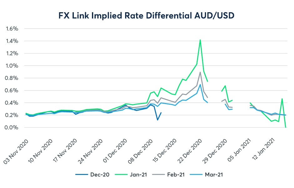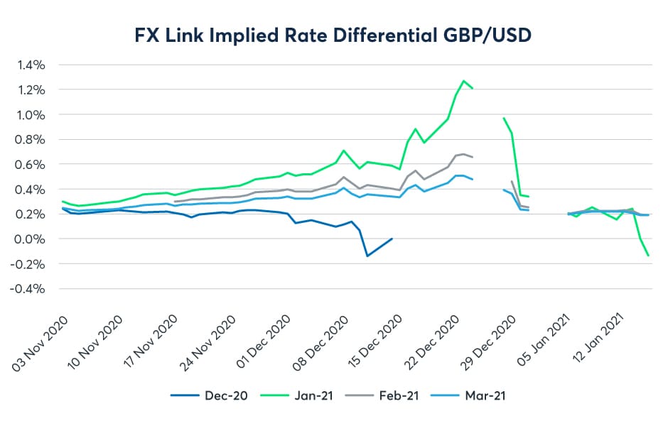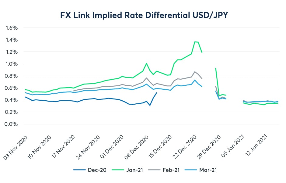 Firstly, while there is likely to be a desire to hold cash across the year end in all currencies, the change in the implied rate differential shows how much more significant the impact is for U.S. dollar funding. Charts for all eight currencies in the FX Link system show an increase in the rate differential favoring the U.S. dollar. The rate differential is quoted as the excess of the U.S. dollar rate over the rate for the opposing currency – therefore an increase in the differential means an increase in the U.S. dollar rate compared to the rate in the other currency. It could be that rates in both currencies are expected to increase over the year end, but the U.S. dollar rate is expected to increase more.