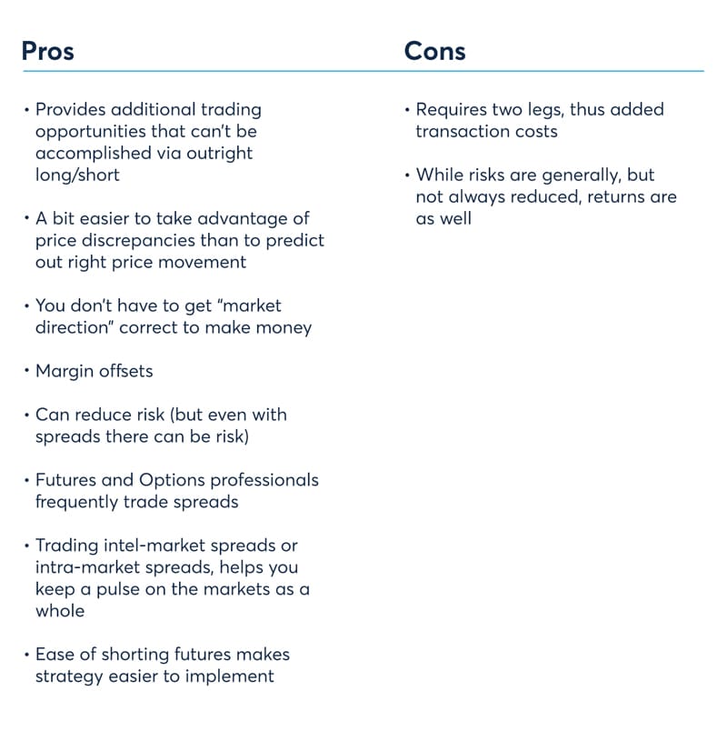 One of the best advantages to spread trading is they often offer margin offsets or discounts. Later in this series, we will have several examples that demonstrate the advantage of margin offset. With margin offsets, traders enjoy significant cost savings! Figure 1 below lists many of the pros and cons of trading spreads with futures.