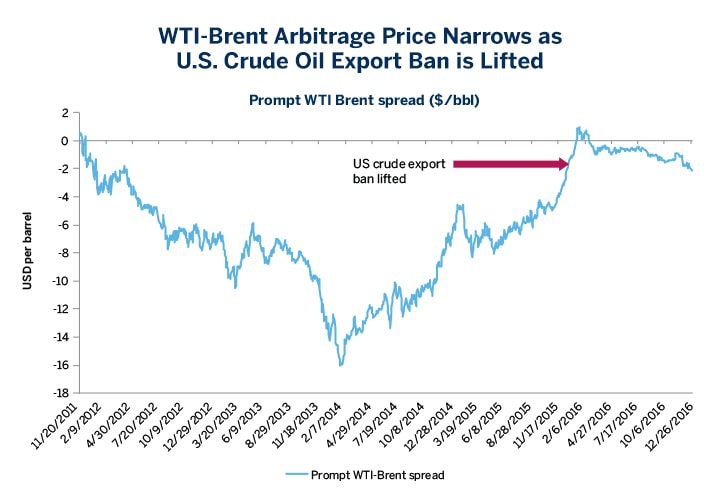 Chart 2: WTI-Brent Arbitrage Price Narrows as U.S. Crude Oil Export Ban is Lifted