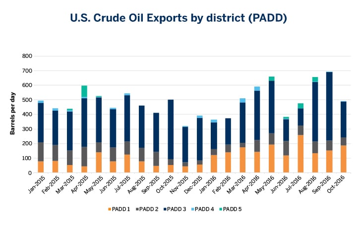 Crude oil exports from PADD 3, which encompasses the U.S. Gulf Coast region, rose to a record high of 410,000 b/d in August 2016, surpassing the previous peak recorded in October 2015.
