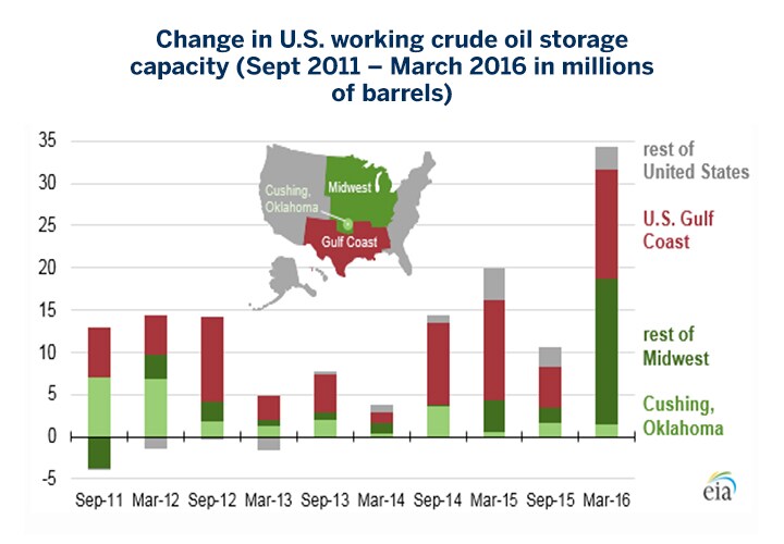 Chart 4: Change in U.S. working crude oil storage capacity (Sept 2011 – March 2016 in millions of barrels)