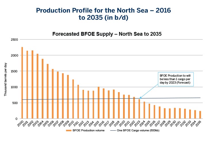 In our analysis of the Wood Mackenzie upstream data, the decline of the Brent, Forties, Oseberg and Ekofisk (BFOE) fields from 2020 onwards is expected to be significant. Based on their data, production is expected to fall from the current 850,000 b/d to under 600,000 b/d by 2023 which is less than one cargo of crude oil per day. This assumes that no changes to the number of crudes in BFOE complex are made before then.