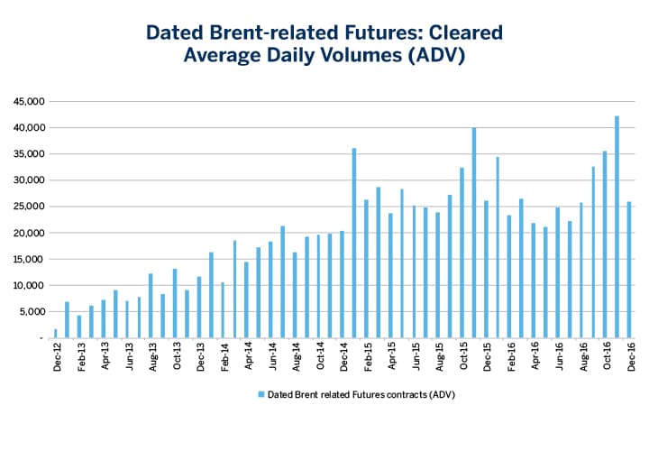 The suite of Dated Brent futures contracts provide a critical component for traders hedging Dated Brent risk on a shorter or longer term basis. The cleared volume of Dated Brent futures contracts has risen steadily over the past four years. According to exchange data, overall cleared volumes of Dated Brent futures were around 26,000 lots per day in 2016, up from 8,000 lots per day in 2013.