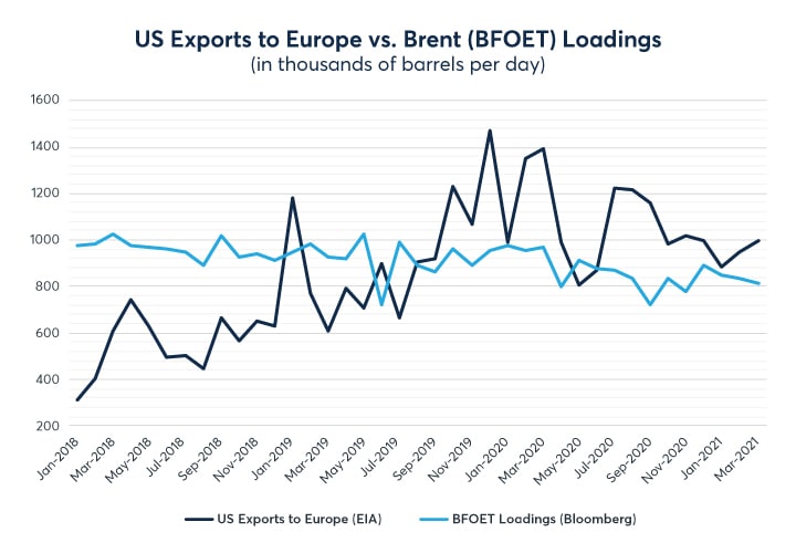 Rising US exports to Europe surpassed Brent supply in 2020