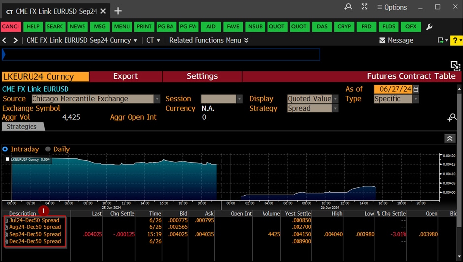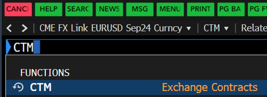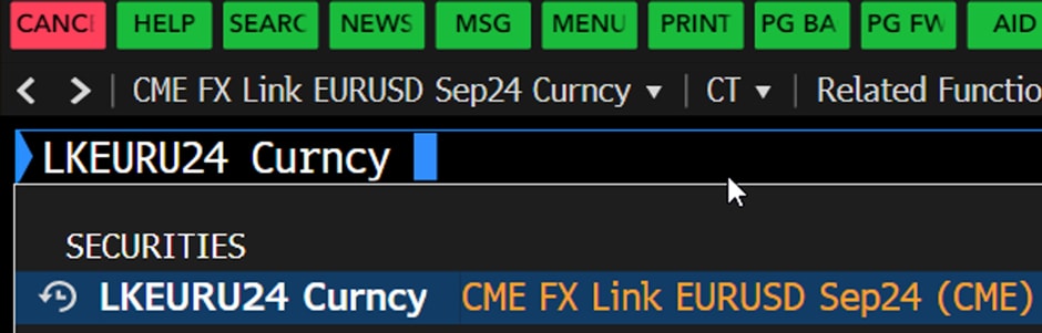 1. Taking EUR/USD FX Link Sept 2024 Settlement as an example, type in “LKEURU24 Curncy CT” and press “Enter”.