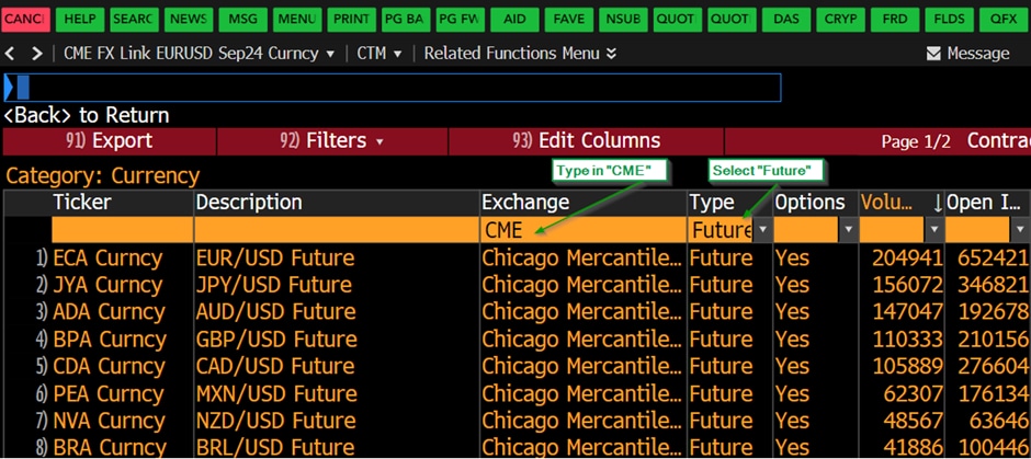Using the codes below, follow these steps to access information about CME Group FX futures through a Bloomberg terminal.