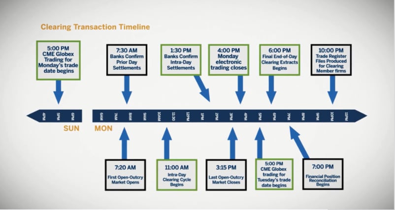 Markets open at 5 p.m. Central Time (CT) on Sunday and close at 4 p.m. CT on Monday. The intra-day clearing cycle for exchange-traded products typically begins at 11:00 a.m. CT and is completed around 1:30 p.m. CT, during which time banking reports are produced and sent to clearing firms.