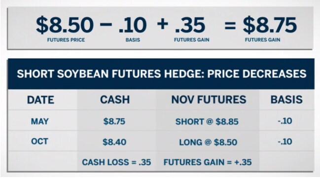 By hedging with November Soybean futures, he locks in an expected selling price of $8.75, which is the November futures price of $8.85 price minus the expected basis of 10 under.