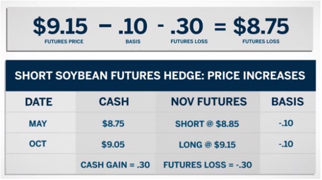 Even though he sold his cash soybeans at a higher price, the producer lost 30 cents on his futures position. This equates to a net sell price of $8.75, which is the futures price of 9.15, minus the basis of 10 under, minus the 30 cent loss on the futures position.