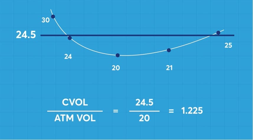 If the volatility curve consisted of strikes with volatilities of 30, 24, 20, 21, and 25; assume the CVOL calculation is 24.5, and the at-the-money implied volatility is exactly 20. The CVOL convexity is calculated by dividing 24.5/20, which is 1.225